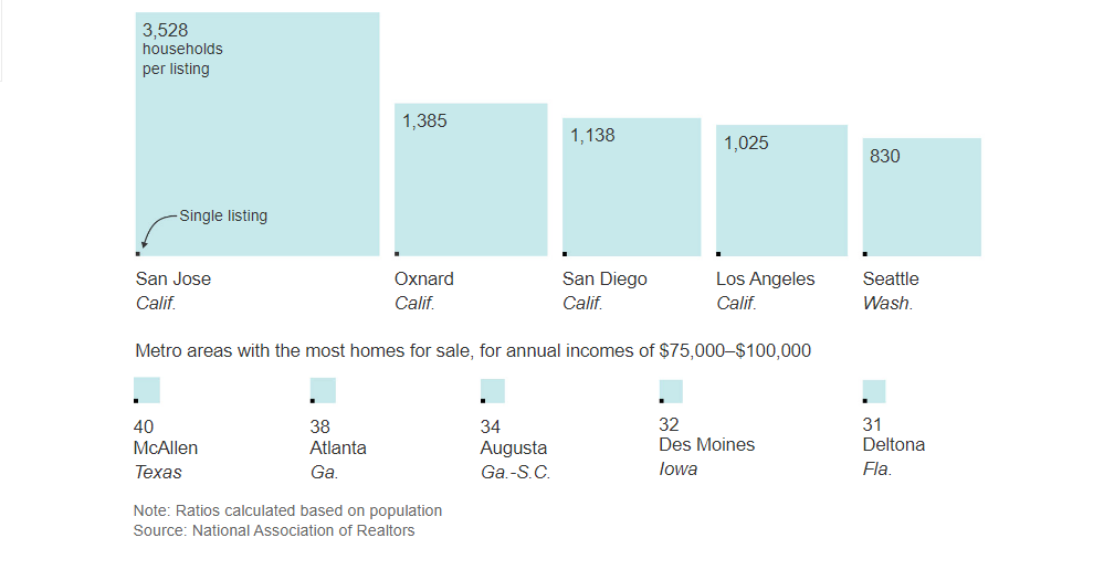 Metro areas with the least homes for sale, for annual incomes of $75,000–$100,000